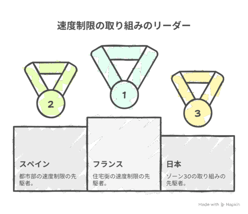 フランスやスペインの都市部では、住宅街や市街地の大半が30km/hに規制され、交通事故死者数の減少に大きな効果を挙げてきました。